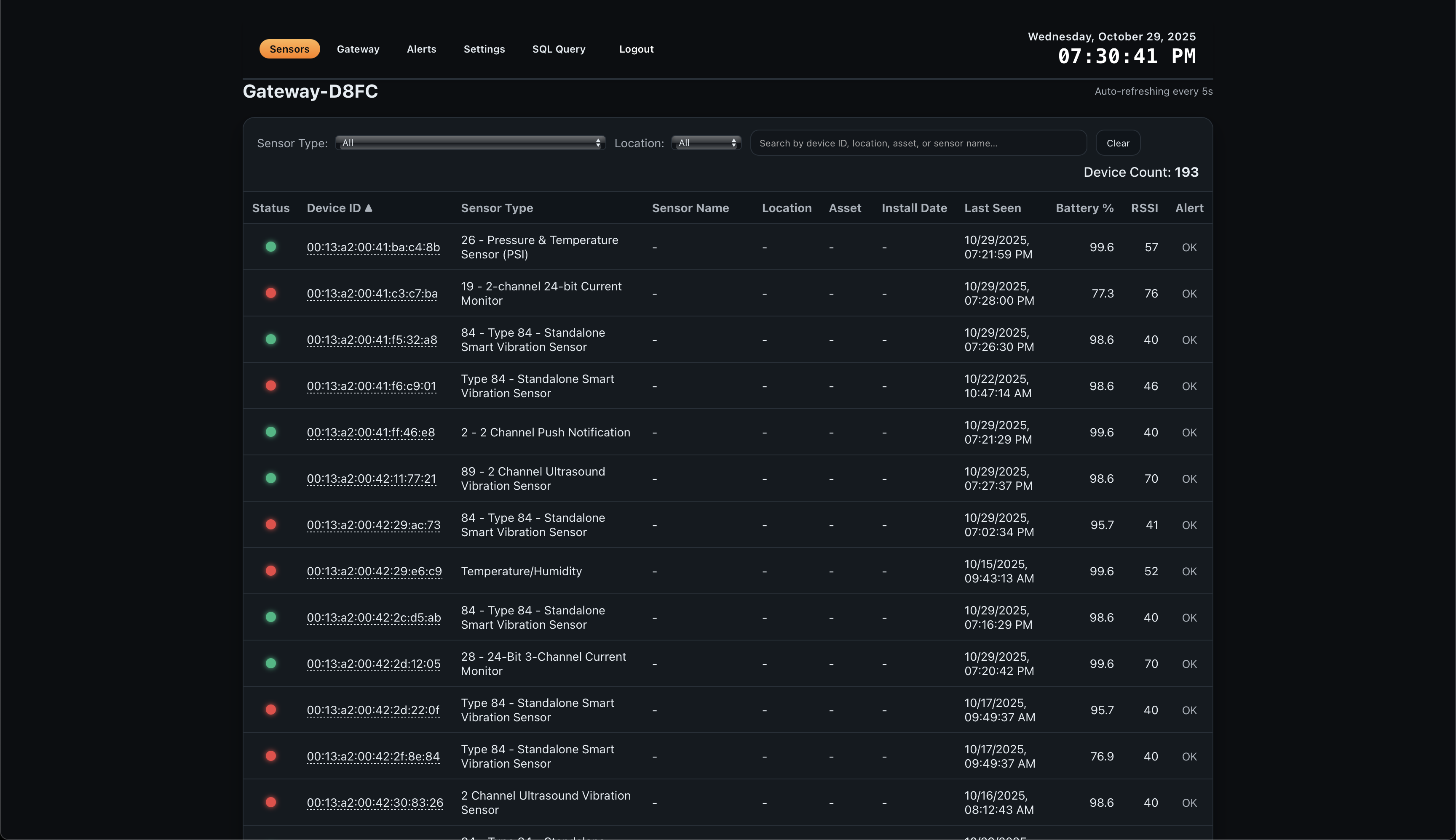 - Real-time sensor list with health indicators