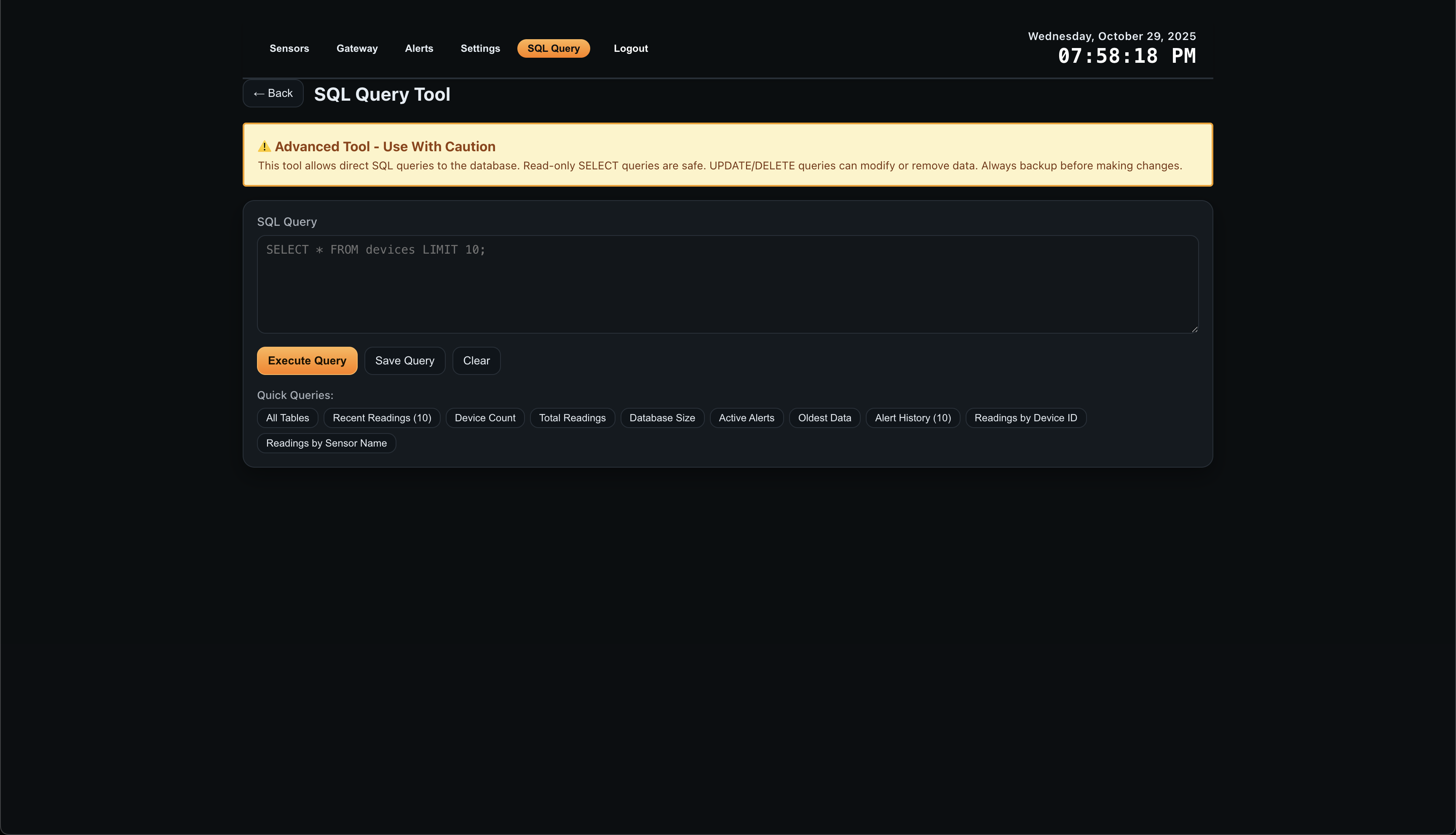 - Sensor dashboards with min/max/avg statistics